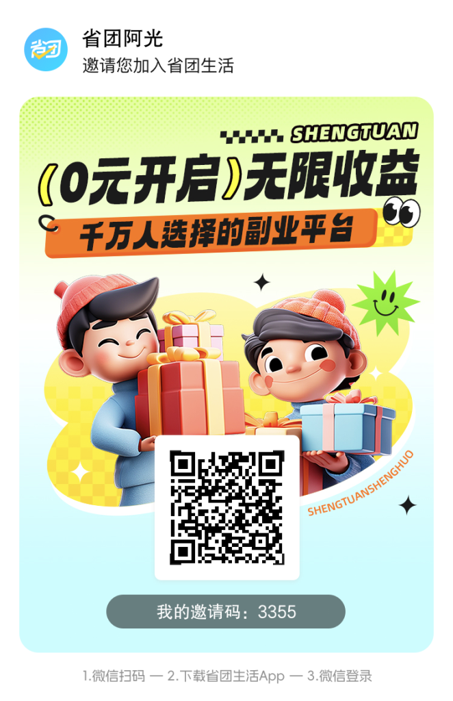 填写省团生活邀请码3355,不仅意味着你将成为省团生活的合伙人,更意味着你将开启一段全新的省钱赚钱之旅。在这里,你将享受到丰富的优惠活动、高额的佣金回报以及专业的推广支持,无论是作为消费者还是推广者,省团生活都将是你不可多得的选择。